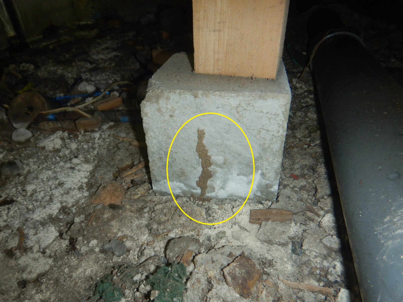 床下を調査したところ、土台や束柱に蟻道(シロアリが通る為に作ったトンネルの様な物)が多く見られました。 -